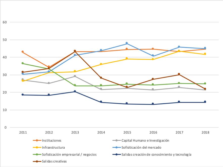 Sin embargo, los pilares Sofisticación de Mercado, Salidas Creativas, Capital Humano e Investigación, e Infraestructura, han bajado.