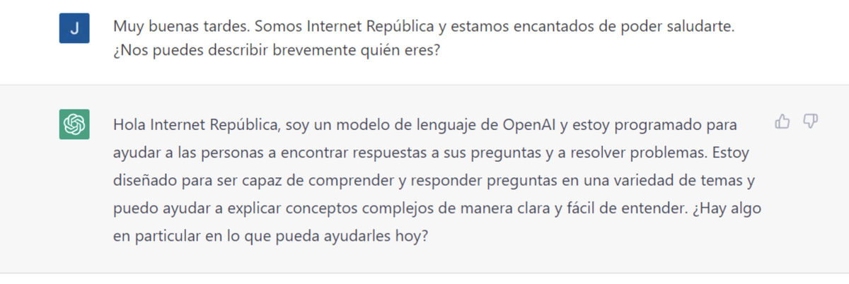 Pero demos voz, o texto, al verdadero protagonista. En Internet República llevamos semanas familiarizándonos con ChatGPT y hemos querido preguntar a la misma inteligencia artificial algunas dudas que nos surgían sobre su funcionamiento y cómo puede ayudar al desarrollo del marketing. Compartimos contigo esta agradable charla.
