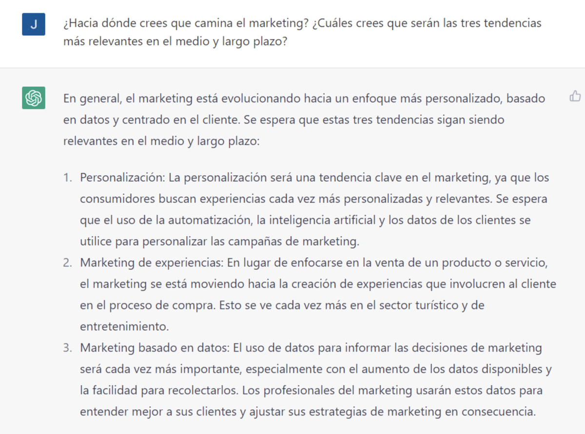 En cierto modo, funciona como un complemento perfecto de las búsquedas de Google. Podemos charlar con el chat de OpenAI sobre infinidad de temas, recibiendo respuestas completas y ahorrando un tiempo importante respecto a las búsquedas. También es un magnífico aliado si necesitamos hacer un brainstorming. Si queremos crear un blog sobre, por ejemplo, tendencias de marketing, basta que le pidamos que nos apunte cuáles son las tendencias más relevantes hoy en día y desarrollar los contenidos a partir de ellas. En paralelo, puede ser una fuente de inspiración muy valiosa, con la capacidad de apuntar aspectos de un contenido que podrían pasar desapercibidos sin su colaboración.