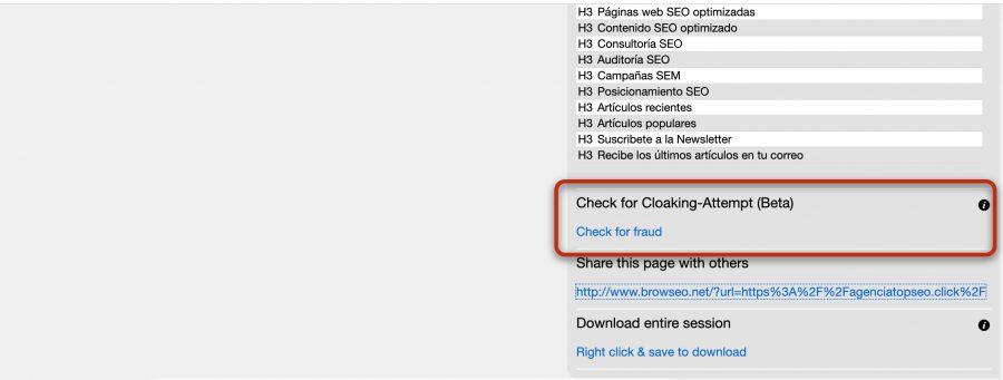 Detección de Cloaking: quiere decir si tu web ha sido o puede ser señalada por engañar a los usuarios mostrando contenido diferente.
