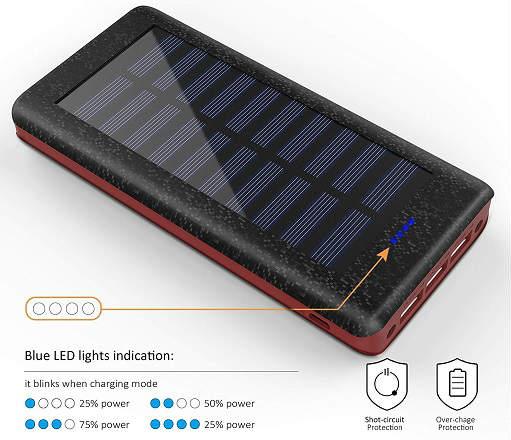 La batería de Wiswan ofrece una capacidad de 24.000mAh. Aunque lo que realmente llama la atención de este dispositivo es que cuenta con ¡un panel solar! Esto permite recargar automáticamente la power bank cuando hace sol y recibe una luz intensa. El dispositivo incluye un pequeño ventilador USB para refrescarse en verano, 2 luces LED para linterna, un indicador de LED de batería restante y 3 puertos USB (2A+2A+1A) para carga simultánea. El puerto de entrada es un micro USB con carga rápida (1A/2A).