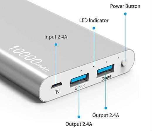La batería externa portátil de 10.000mAh de Kinps se presenta como una buena alternativa de capacidad media, principalmente gracias a un precio bastante goloso. Esta power bank con carcasa de aluminio dispone de 2 puertos USB de carga rápida (2.4A), entrada micro USB (2,4A) y botón de encendido.