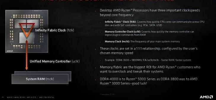 Según la diapositiva filtrada, la próxima serie de CPU AMD Ryzen 5000 tendrá tres velocidades de reloj interno que están relacionadas con la memoria que se utiliza dentro de la computadora. Estos son los siguientes:Infinity Fabric Clock (FCLK): gobernará la rapidez con la que los núcleos de la CPU pueden comunicarse a través de las matrices de la CPU y con el controlador SoC (por ejemplo, PCIe, SATA, USB).