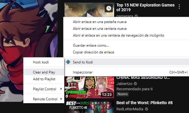 Send to Kodi es una extensión muy parecida a Play to KODI. No solo nos permite enviar videos de YouTube directamente a KODI: también funciona con Twitch, Vimeo y direcciones URL (magnets y torrents).Está disponible tanto para Chrome como Firefox, y funciona simplemente haciendo clic derecho sobre cualquier enlace y seleccionando “Send to KODI -> Clear and Play”. En su contra juega que no tiene muchas opciones de configuración, y que tampoco tiene ninguna página de ayuda, lo que nos puede dar algún que otro dolor de cabeza si tenemos algún problema con la configuración inicial.