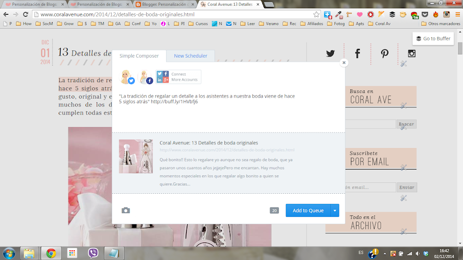 Con ella lo que podemos hacer es fácilmente compartir algo que hemos visto en otra página, lo que es muy práctico. Por ejemplo, veo este artículo de detalles de boda originales y quiero compartirlo. Pues selecciono el texto que quiero compartir (que puede ser el título o cualquier frase del propio artículo o post) y le doy al iconito de Buffer: