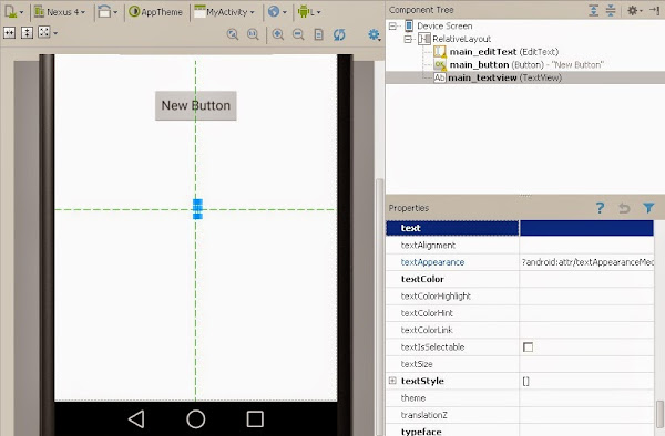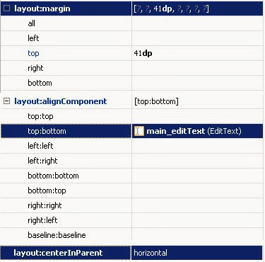 Al seleccionar el botón veremos que está ubicado en la parte inferior del editText, con una margen superior de 41dp y alineado horizontalmente. Estas características se representan con los atributos layout:margin , layout:alignComponent y layout:centerInParent.