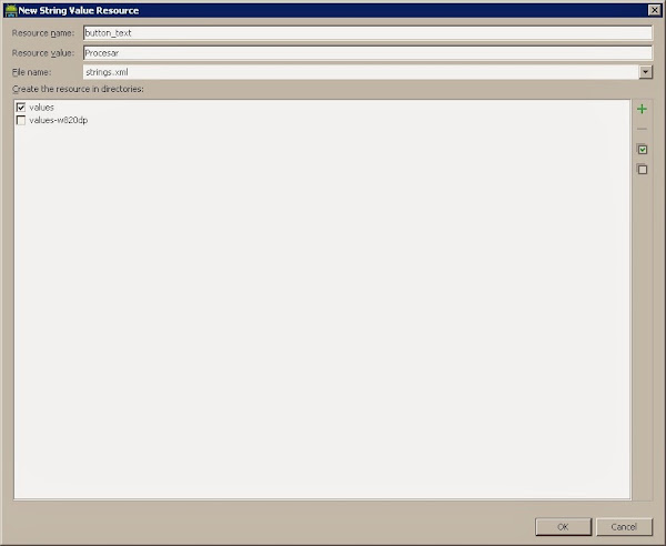 Guardamos y el recurso estará creado. Si deseas abre el archivo strings.xml y comprueba la existencia de los nodos que acabas de crear.<?xml version="1.0" encoding="utf-8"?>