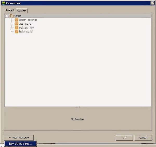Ya que el recurso que necesitamos usar aun no existe, debemos crearlo. Así que haremos clic en "New Resource" y seleccionaremos "New String Value...".