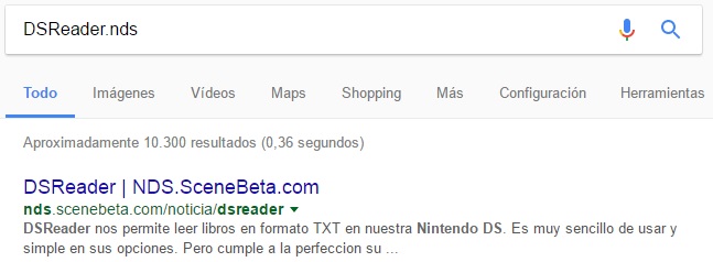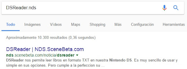 Ponemos en Google las palabras: DSReader.nds que es como se llaman los drivers (Por supuesto si tenéis otro tipo de consola tenéis que buscar los drivers correspondientes pero no os preocupéis, SanGoogle os proveerá).
