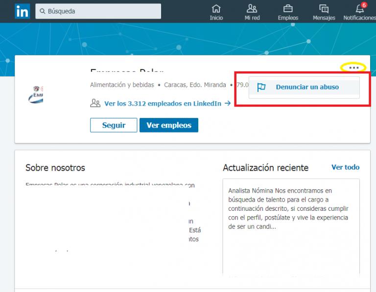 LinkedIn no nos brinda la opción de poder bloquear a una empresa, pero nos da una alternativa bastante congruente: Denunciar un abuso.