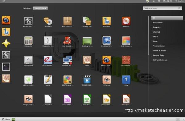 Las diferencias más notables en Linux Mint 12 es el MGSE, también conocido como M int G nome S hell E xtension. Como su nombre lo indica, se trata de una extensión de Gnome Shell construida sobre Gnome 3 y te puedo decir que es increíble. El MGSE trae de vuelta el panel inferior y el popular MintMenu. Le permite usar Linux Mint de la manera tradicional sin perder la funcionalidad de Gnome 3.