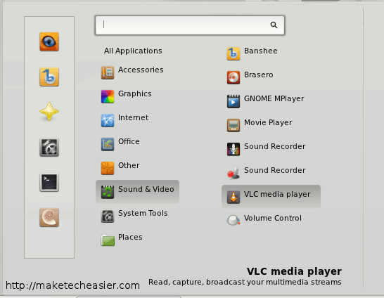 El menú MGSE viene con una barra lateral izquierda de acceso directo donde puede acceder rápidamente a sus aplicaciones favoritas, como Firefox, Banshee, Gnome Tweak Tool, Terminal, Carpetas, etc. Una cosa es que la barra de accesos directos no parece ser configurable. No puede agregar o quitar aplicaciones de la lista. También hay una barra de búsqueda donde puedes buscar aplicaciones.