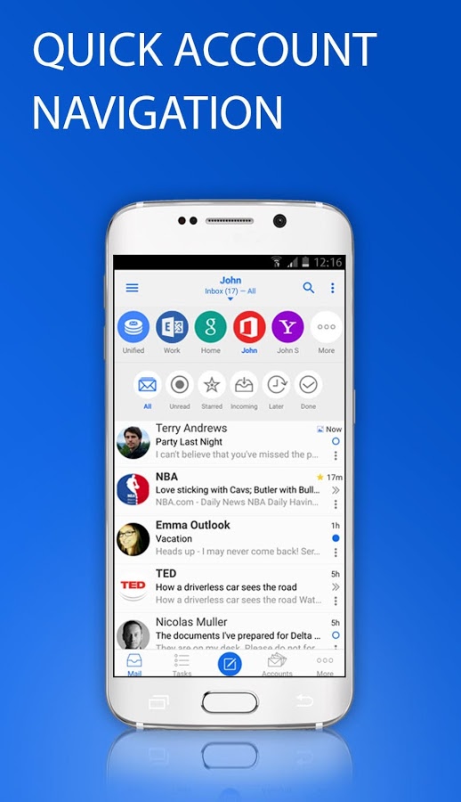 Esta aplicación te permite hacer login para todas las cuentas de correo que se tengan. La mejor característica es la detección automática del servidor para cualquiera de los clientes de correo que sean. algunos de los proveedores donde podreis configurar vuestras cuentas sin salir de esta app son: Gmail, Yahoo, Outlook, AOL, FPT, iCloud, Office365, Google Apps, Hotmail, MSN, Live, Yandex, ymail, iCloud, Mail.ru, GMX, mail.com, Hushmail, Zoho, Web.de, QIP, Rambler. A su vez cuentas IMAP y POP3.