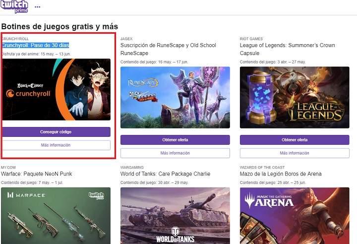 Ahora que ya tenemos nuestra cuenta de Twitch Prime preparada, entramos en la siguiente página de Twitch. Entre las diversas ofertas y botines de juego gratuitos para Twitch Prime localizamos la promo “Crunchyroll: Pase de 30 días“. Por último, pulsamos sobre “Conseguir código” y copiamos el código alfanumérico que se mostrará en pantalla.