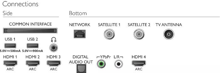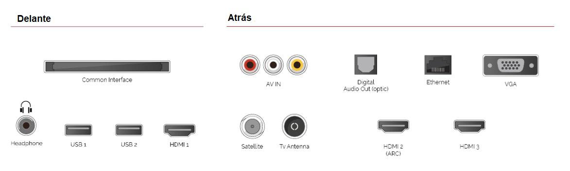 4 entradas HDMI (una es eARC), diferentes entradas de TDT y TV, jack 3.5mm para auriculares, puerto AV IN Video Audio L-R, cable Ethernet, cable óptico, USB 3.1, etc.