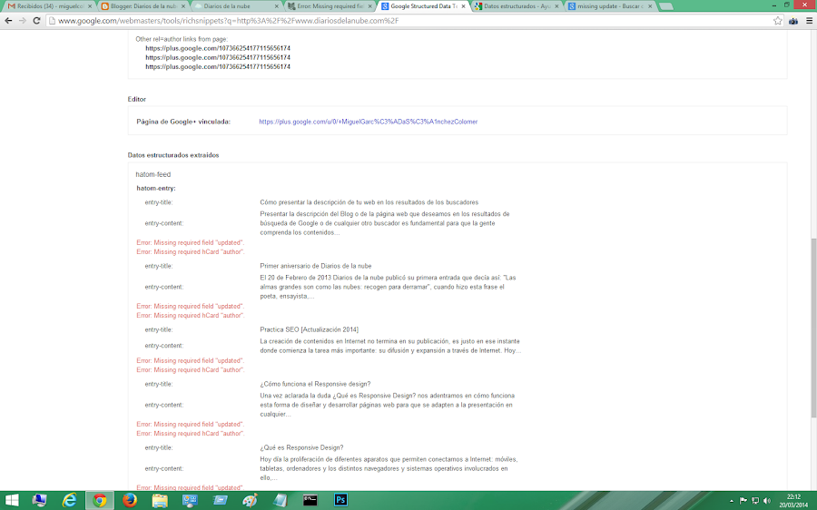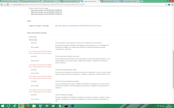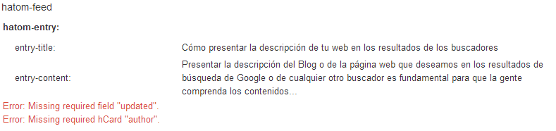 Son estos dos puntos, los datos estructurados que con mayor frecuencia dan problemas en Blogger. Cuando lanzamos una prueba de datos estructurados en las herramientas para webmasters de Google solemos encontrarnos en los resultados escrito en rojo: