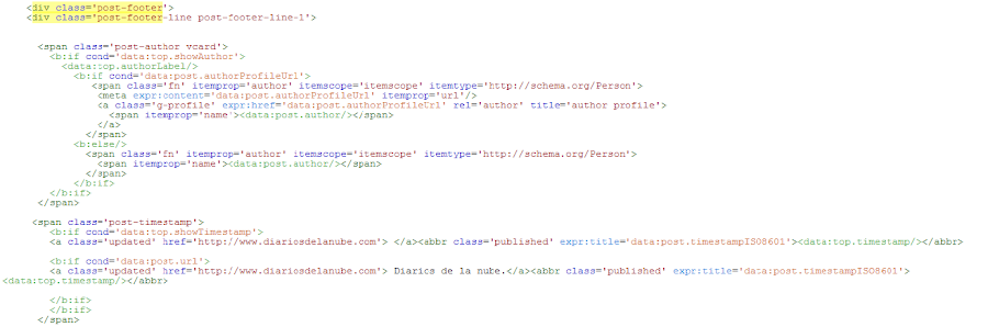 La colocación de la fecha de actualización de un post y de su autor no tiene porqué ser la misma en todas las plantillas de un Blog. Aunque muchas veces en las plantillas de Blogger estándar se encuentran por el <div class="post-footer">, en algunos casos pueden encontrarse en otras partes del código.
