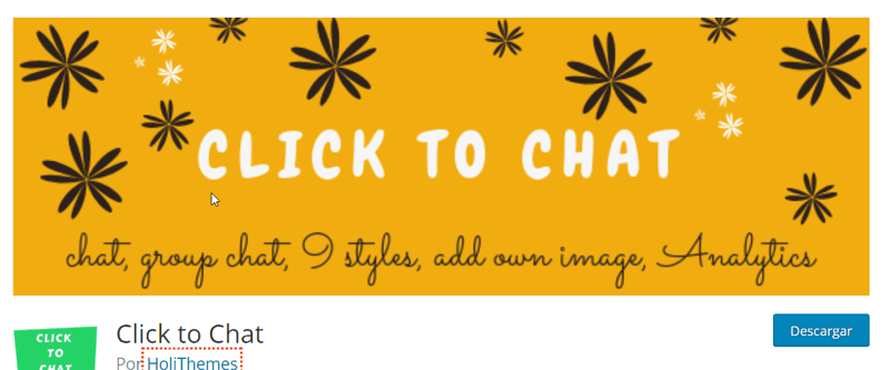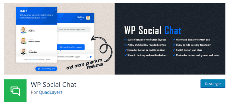 Plugin muy conocido que cuenta con más de 100.000 instalaciones.Muy sencillo de manejar, sólo tienes que añadir nuevo plugin-activar automáticamente ya tendrás en tu web el icono del WhatsApp para poder chatear.