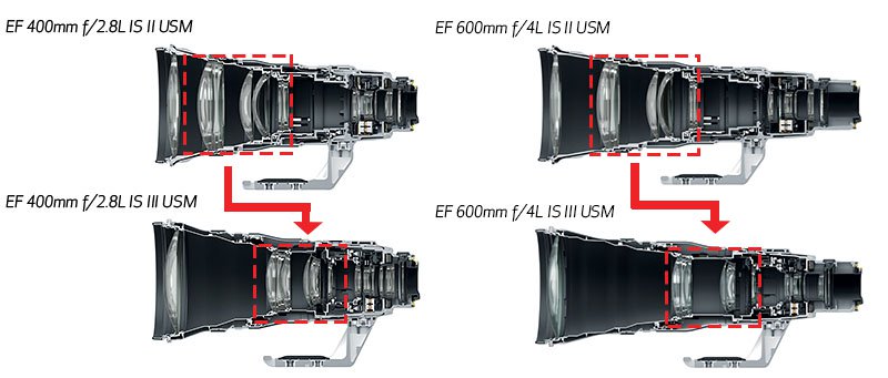 Ambos lentes son los más livianas del mundo para sus respectivas distancias focales. El EF 400 mm f / 2.8L IS III es 1 kg (más del 25%) más liviano que la versión Mark II , bajando de 3.85 Kg a 2.8 Kg.