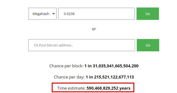 Yo tengo 3 Nerdminer, lo que equivale a 238k/s y según esta calculadora minaria SEGURO 1 bloque en los siguientes años, no obstante se puede dar la suerte de que mañana me tocase.