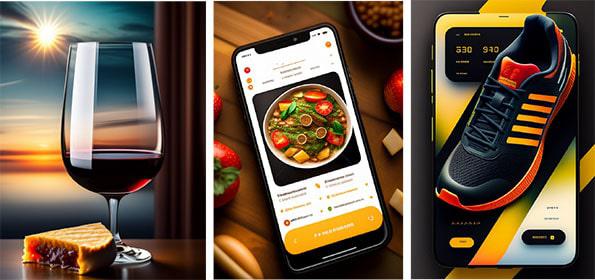La IA permite Landing con fotos como las siguientes: para vinos, productos masivos y calzados, etc. Hechos con IA.