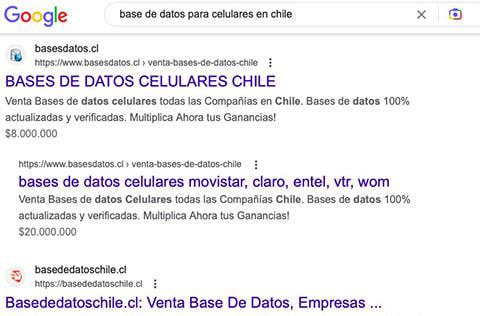 Al buscar en Google bases de datos para celulares en Chile, nos aparecen 2 web que ofrecen registros y que al parecer son la misma empresa (navegamos en ambas).