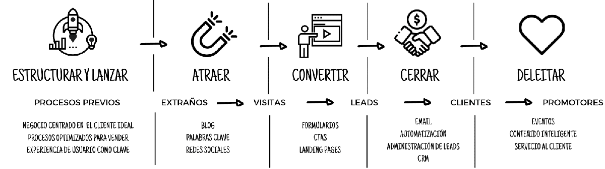 Quizá la imagen anterior te suene a chino, pero prometo que al final de este artículo entenderás a la perfección todos los pasos, por ahora es importante que te quedes con las 4 etapas básicas del marketing, que son: