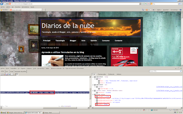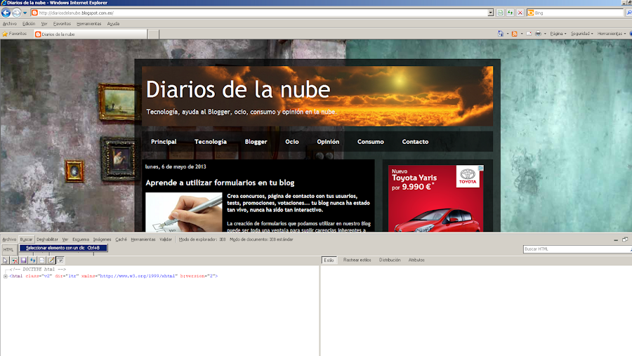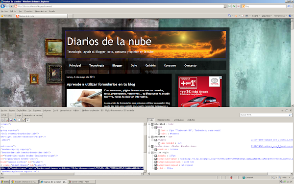Para realizar la "medición" en píxeles del ancho y alto del "marco" de la imagen, abrid vuestro blog en Internet Explorer o Chorme (en Mozilla lo que voy a explicar requiere tener instalado "Firebug"). Una vez se muestre la pantalla principal pulsad F12 y se os abrirá el editor de desarrollo que Explorer o Chrome incorporan de serie: