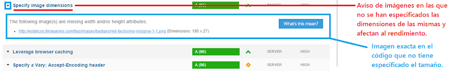 Especificar el tamaño exacto de las imágenes y evitar el escalado por navegador: las dimensiones en el código fuente son importantes. Es fundamental especificarlas con claridad para que el navegador no tenga que interpretar los tamaños a los que debe dibujar las imágenes. De esta manera se evita el escalado y otros problemas que pueden afectar al rendimiento.