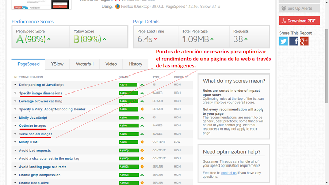 Gracias a GTMetrix, en el análisis de Google Pagespeed, podréis ver los avisos de las imágenes que no tienen dimensiones especificadas, aquellas cuyo peso no ha sido optimizado y las que requieren escalado por parte del navegador.