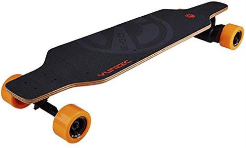 El longboard eléctrico de la marca Yuneec. El modelo Yuneec Elektro EGO se compone de una cubierta de 12 mm de grosor formado por 8 capas de arce canadiense las cuales proporcionan flexibilidad y estabilidad permitiendo desplazamientos muy cómodos y fluidos. La tabla viene teñida en color naranja para proporcionarle un diseño moderno y llamativo. El motor y la batería se han ocultado en la parte baja y se ha recubierto de materiales resistente obteniendo un skateboard eléctrico no solo robusto y duradero sino con un diseño muy elegante.