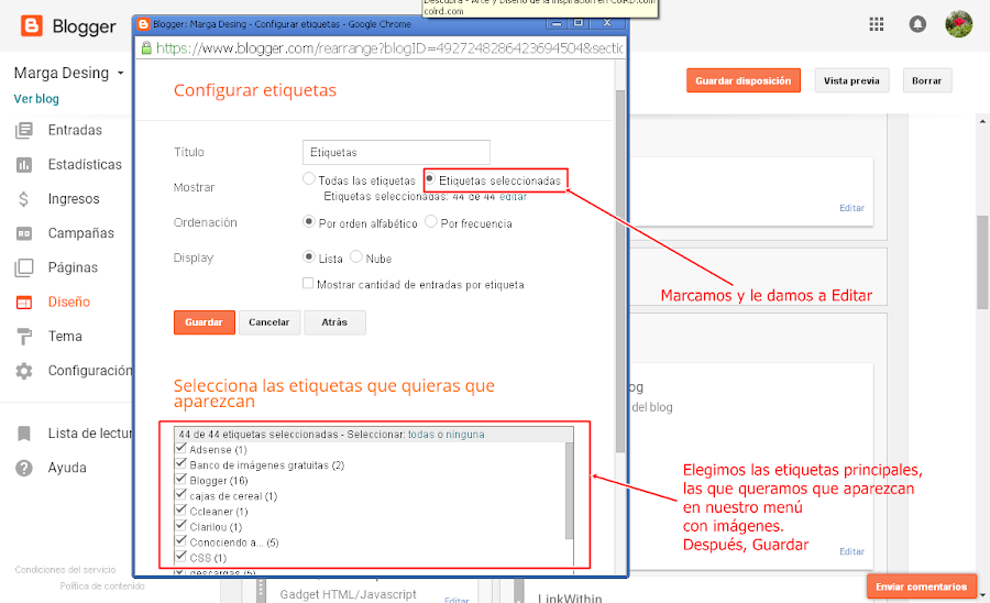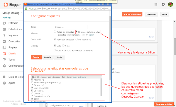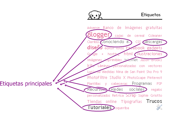 También es primordial, tener tus entradas del blog clasificadas por etiquetas. Cada vez que realizas una entrada, debes incluir una etiqueta principal porque eso servirá para agrupar las etiquetas principales y así crear tu menú con imágenes y también otras que consideres que están relacionadas con el post.