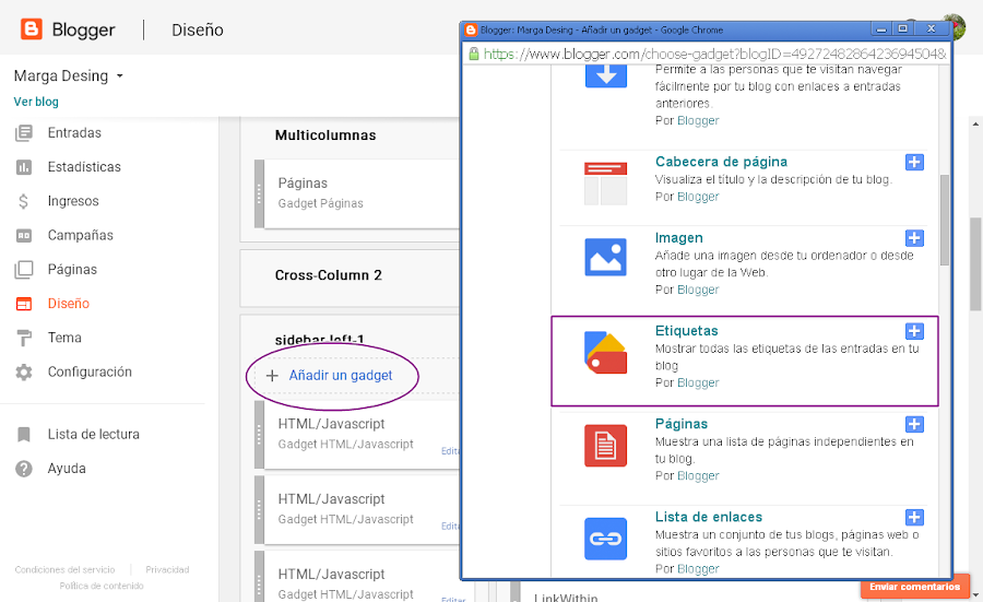 Te vas a Diseño y agregas un gadget de etiquetas.