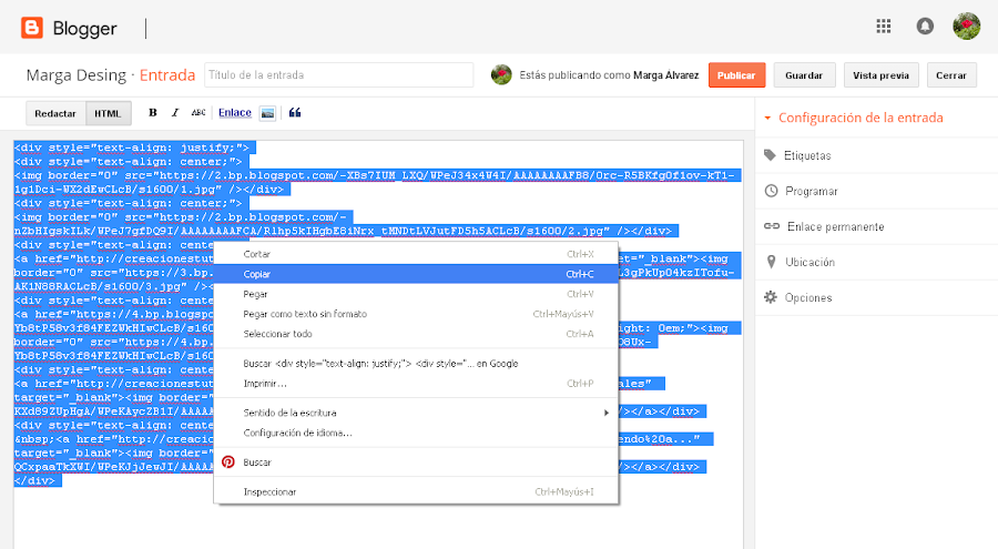 Cuando terminemos, le damos arriba a HTML y os aparecerá el código completo de todas las imágenes que habéis colocado con sus enlaces. Seleccionáis todo el código y le dais a copiar con el botón derecho del ratón.