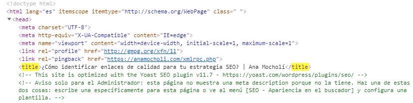 Este es el principal, tiene una relación directa con el posicionamiento SEO y debería ser único. Es decir, cada url de tu página debería tener su propio title. Si tomamos como ejemplo mi web, el inicio tiene un title, la parte de blog tiene otro title y cada artículo también tiene el suyo propio.Es cierto que en algunas circunstancias como la paginación o las búsquedas podría ser una excepción, o generarse de forma automática y que en el texto del title se muestre la paginación o similar.