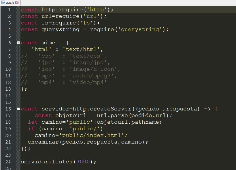 const servidor=http.createServer((pedido ,respuesta) => { const objetourl = url.parse(pedido.url); let camino=public+objetourl.pathname; if (camino==public/) camino=public/index.html; encaminar(pedido,respuesta,camino);});