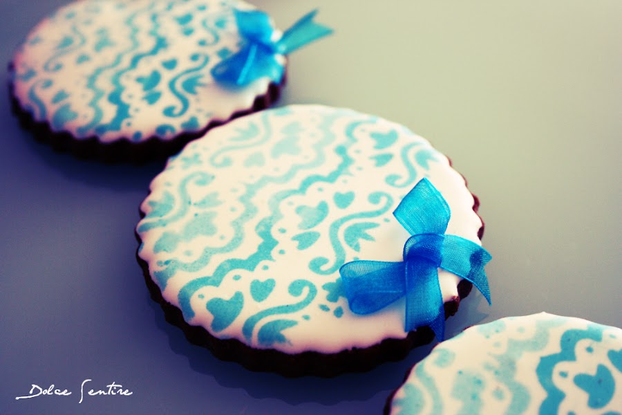 Galletas blue lace: tutorial cómo usar stencils sobre glasa, del blog Dolce Sentire