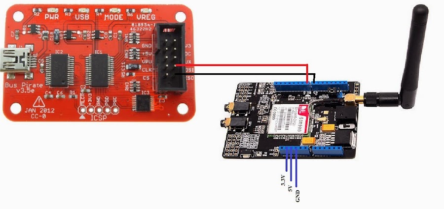 Conectamos una fuente externa de 3.3V y 5V al módulo GPRS. Para esto utilicé el arduino como fuente de poder, en circuitos que demanden menos corriente se puede utilizar directamente el BusPirate, pero en este caso no es recomendable.