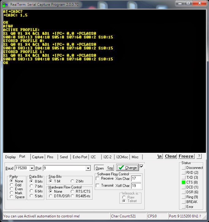 Una vez conectado, la respuesta que obtenemos en el Realterm se muestra en la figura 3. En este caso, enviamos "AT+CADC?" y obtenemos el valor del conversor ADC, en este caso "1,5", además enviamos "AT&V" y obtenemos la configuración del módulo.