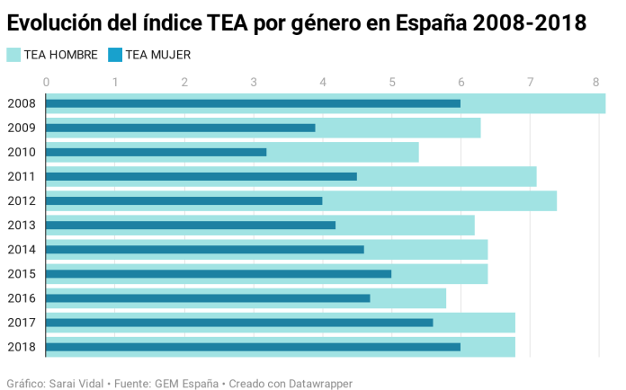De cada diez personas emprendedoras identificadas, entre cinco y seis eran hombres y entre cuatro y cinco eran mujeres. Esta diferencia también se observa dentro de la población de empresarios consolidados, que en 2018 estaba compuesta en mayor medida por hombres (54,4% del total) que por mujeres (45,6%). Asimismo, la presencia masculina predominó sobre la femenina dentro de la población que esperaba crear un negocio en los próximos tres años (58,4% de presencia masculina frente a 41,6% de presencia femenina), y dentro de la que estaba involucrada en el abandono reciente de un negocio (55% de presencia masculina frente a 45% de presencia femenina).Datawrapper: Evolución del índice TEA por género en España 2008-2018