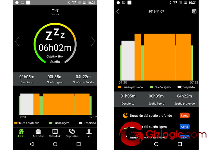 Segunda pantalla (Health): Monitor cardíaco permanente, monitor de sueño con las horas registradas.