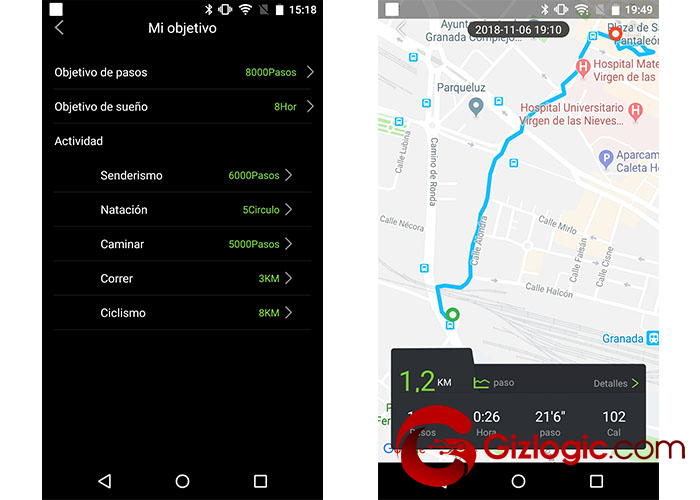 Herramientas deportivas y de salud. Este smartwatch cuenta con un podómetro que registra los pasos y calcula la distancia recorrida. Hasta aquí nada nuevo, pero este modelo incluye GPS para obtener un posicionamiento con muestra en Google Maps. Sal a correr o montar en bicicleta con el GPS activado del reloj y se verá reflejado tu trayecto en la app, tal como se puede ver en la captura. El registro de la posición no está disponible en el modo de caminata y no entendemos muy bien por qué.