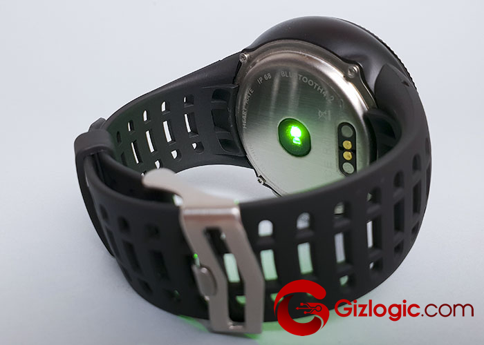 En la zona posterior del No.1 F18 tenemos el conector de carga magnético y el sensor cardíaco óptico. La tapa trasera es de aluminio. Para el frontal del reloj, la marca nos sorprende con el “display esférico” que da más cuerpo a la pantalla. La marca ha colocado un cristal que produce ese efecto. Con la elección de un panel TFT a color de 1,3″ y una resolución de 240 x 240 píxeles. La pantalla es táctil para la navegación.