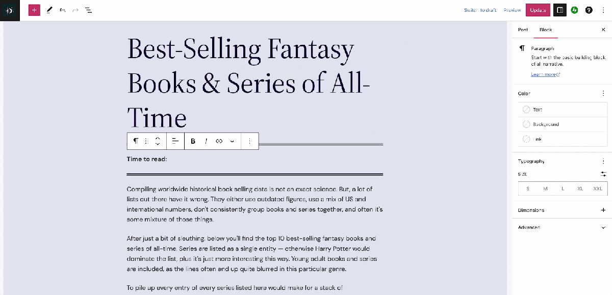 Esta es una curiosa función integrada que mucha gente no conoce: en el editor de WordPress.com hay una función que muestra de un vistazo todos los encabezados de la entrada, además de un recuento de caracteres y palabras, y un tiempo de lectura estimado de cuánto tiempo tardaría un lector medio en leer el contenido de la página.Incluso puedes mostrar este tiempo estimado en tu sitio con el bloque Tiempo de lectura. (Las personalizaciones de estilo están de camino).