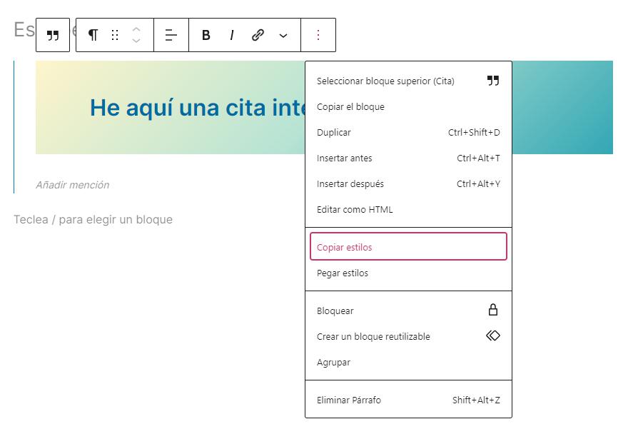 Además de copiar y pegar texto de un bloque a otro, ahora también puedes copiar todo el estilo de un bloque (los colores, la tipografía, etc) y pegarlo en otro bloque del mismo tipo.Desde el menú de ajustes de un bloque, selecciona Copiar estilos. Después, cuando añadas un nuevo bloque, selecciona Pegar estilos en el menú de ajustes para transferir todas las preferencias de diseño.