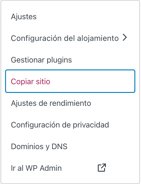 Desde el escritorio de wordpress.com/sites, haz clic en el menú de tres puntos, pulsa Copiar sitio, confirma los siguientes pasos y ¡listo!. Esta función está disponible en los planes Business y Commerce con las funciones de alojamiento activas.