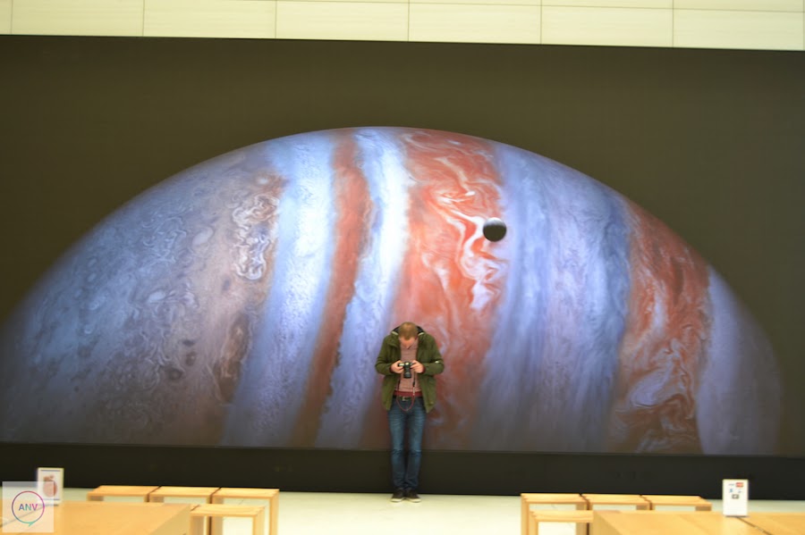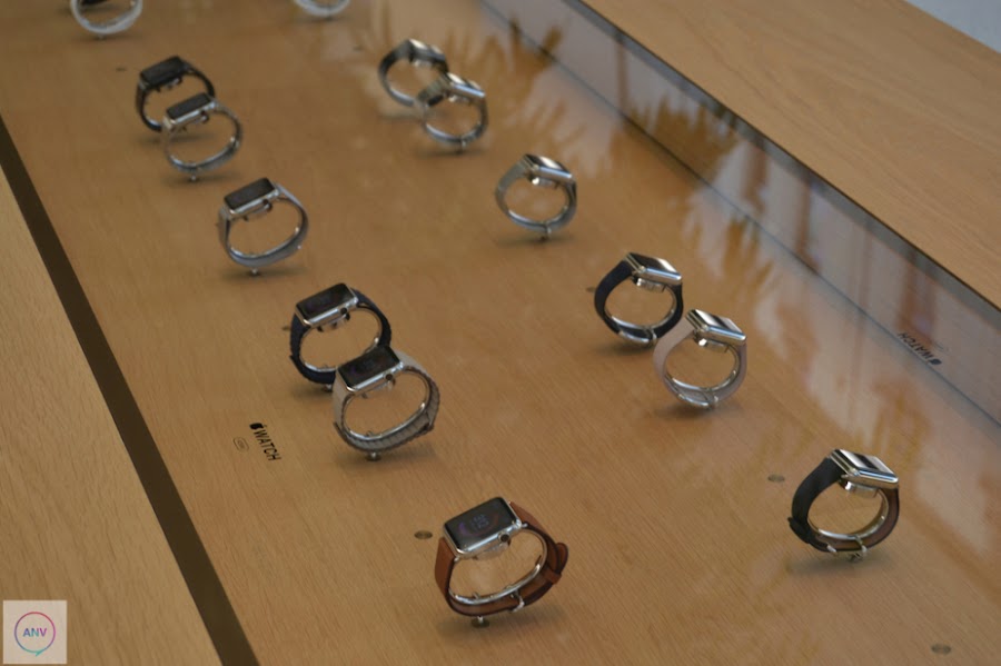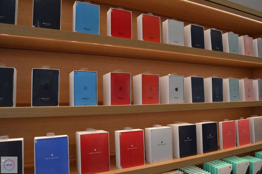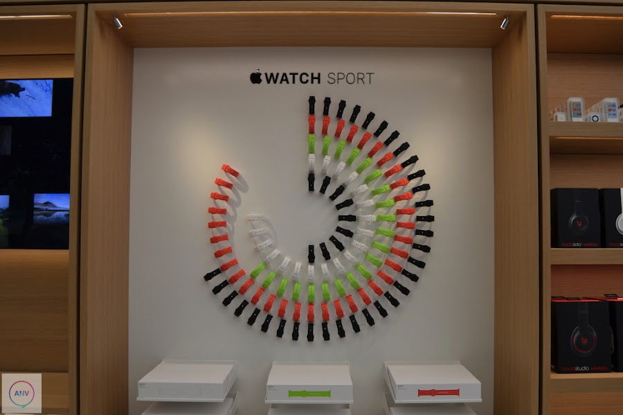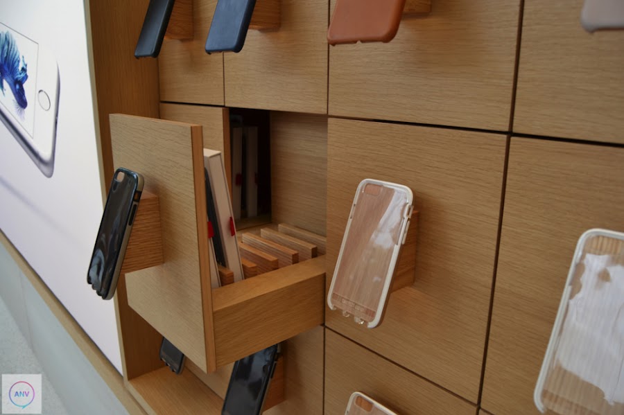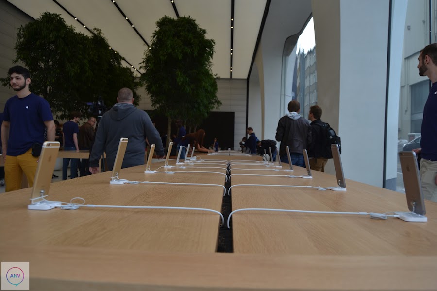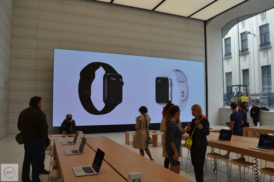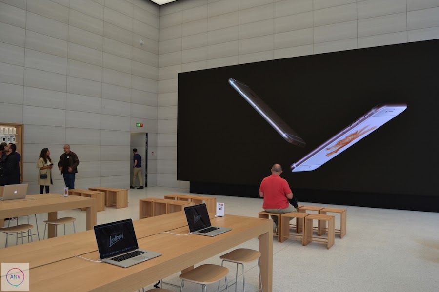 La disposición de la tienda ha sufrido un completo cambio trasladando la Genius Bar al centro de la tienda con las mesas rodeadas de esos árboles. En las paredes han dispuesto de muchísimos artículos en exposición. Además, otra de las novedades que trae esta nueva tienda de Apple es la enorme pantalla que reina la pared del fondo de la tienda. Una pantalla en la que continuamente se está haciendo publicidad de sus artículos pero que será utilizada como herramienta para los distintos eventos que se celebren dentro de la propia tienda. Además, Apple ha suprimido los iPads que servían de ayuda a los clientes para conocer las características de los productos en exposición y ha dispuesto de las nuevas mesas donde se exponen los Apple Watch.
