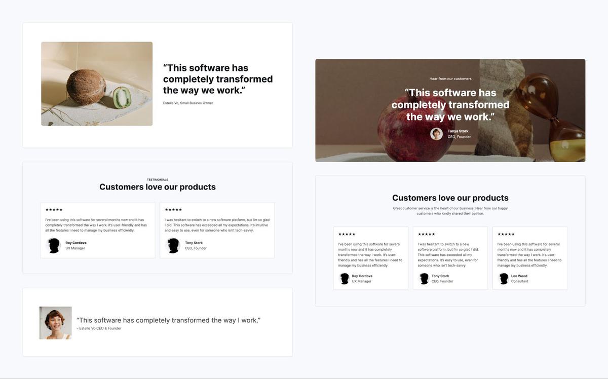 Genera confianza y credibilidad en tu pequeña empresa con testimonios de clientes. Elige entre varios patrones especialmente diseñados para que las historias y experiencias de tus clientes aparezcan en tu web de forma atractiva.Servicios