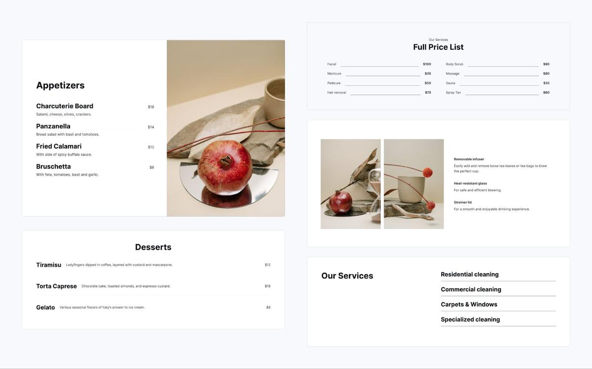 En todas las webs de pequeñas empresas hay una sección de servicios, donde aparece toda la información sobre lo que ofreces. Ya seas un restaurante, un centro de estética o un servicio de limpieza a domicilio, tenemos el patrón perfecto para publicar tus productos y servicios.Precios