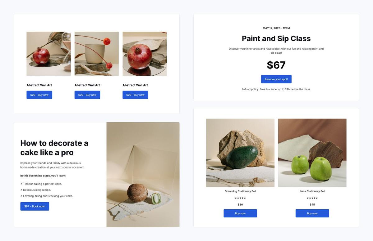 Acepta pagos con tarjeta de crédito o débito fácilmente con nuestro bloque Pagos. Tienes a tu disposición un montón de opciones con diseños modernos para que el proceso de pago sea práctico y atractivo visualmente para tus clientes.¡Explora todos nuestros patrones!